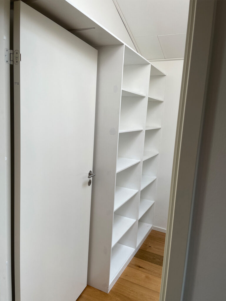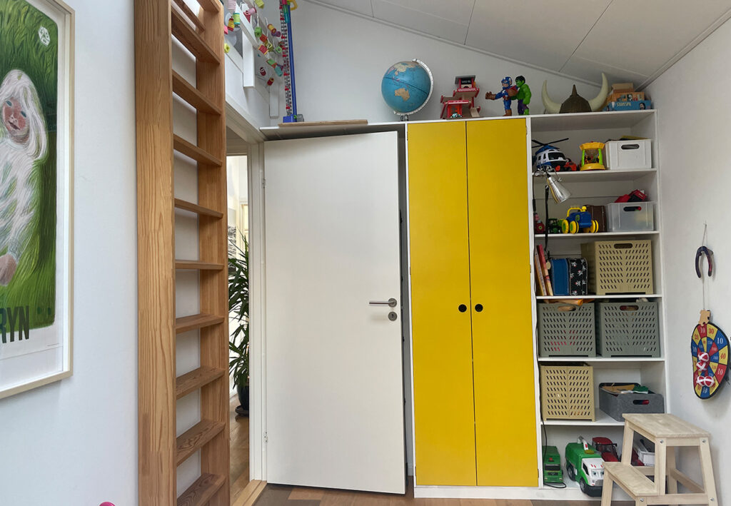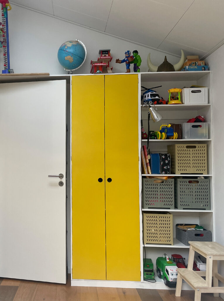 For at udnytte pladsen optimalt på det lille børneværelse -og ikke mindst udnytte højden -byggede vi et skab, som passede præcis til dette rum.